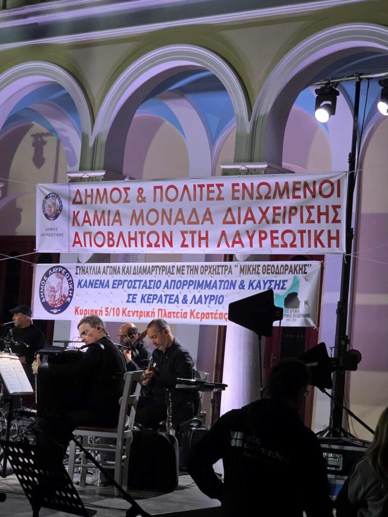 Μια μεγάλη συναυλία διαμαρτυρίας πραγματοποιήθηκε το βράδυ της Κυριακής 5 Οκτωβρίου 2025 στην κεντρική πλατεία της Κερατέας, με πρωτοβουλία του Δήμου Λαυρεωτικής. Η εκδήλωση είχε ως στόχο να εκφράσει την αντίθεση της τοπικής κοινωνίας στα σχέδια δημιουργίας εργοστασίου καύσης απορριμμάτων στην περιοχή.